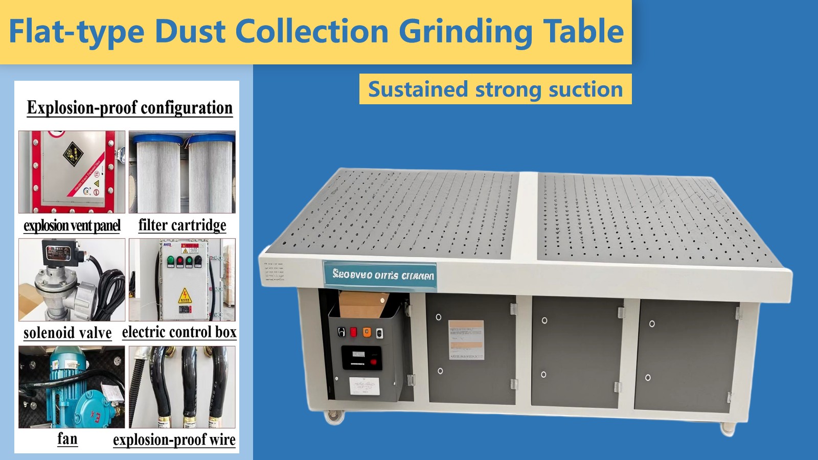 Ingurumena errespetatzen duena eta eraginkorra: hautsa xurgatzen duen lixatzeko mahai lauak artezketa iturrian hautsa ken dezake, hautsaren sakabanaketa modu eraginkorrean kontrolatu eta ingurumenerako hautsaren kutsadura murrizteko eta operadoreen osasunerako kalteak murrizten ditu.
